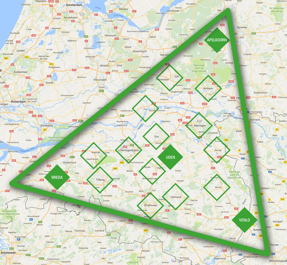 ACS Schoonmaak is dagelijks actief voor uiteenlopende bedrijven, scholen en instellingen binnen de driehoek Venlo, Apeldoorn en Breda. In grotere plaatsen als Eindhoven, Den Bosch, Nijmegen en Helmond zijn we intensief vertegenwoordigd. Deze regionale insteek is een bewuste keuze. Want binnen deze straal van tachtig kilometer rond Uden kunnen wij u altijd continuïteit en kwaliteit garanderen. Is een van onze medewerkers ziek of op vakantie? Dan is een collega uit de buurt snel bij u ter plaatse.
